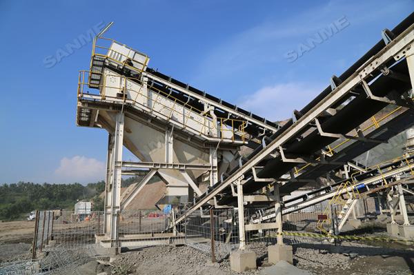 The coarsely crushed materials are screened by vibrating screen and then conveyed by belt conveyor to cone crusher for medium and fine crushing.